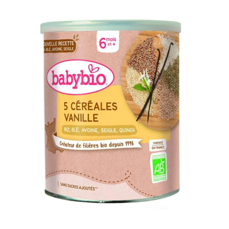 | Composition | Farine de riz* 88,9%, farine de quinoa* 9,8%, extrait de vanille Bourbon*, thiamine (vitamine B1). * Issus de l’agriculture biologique