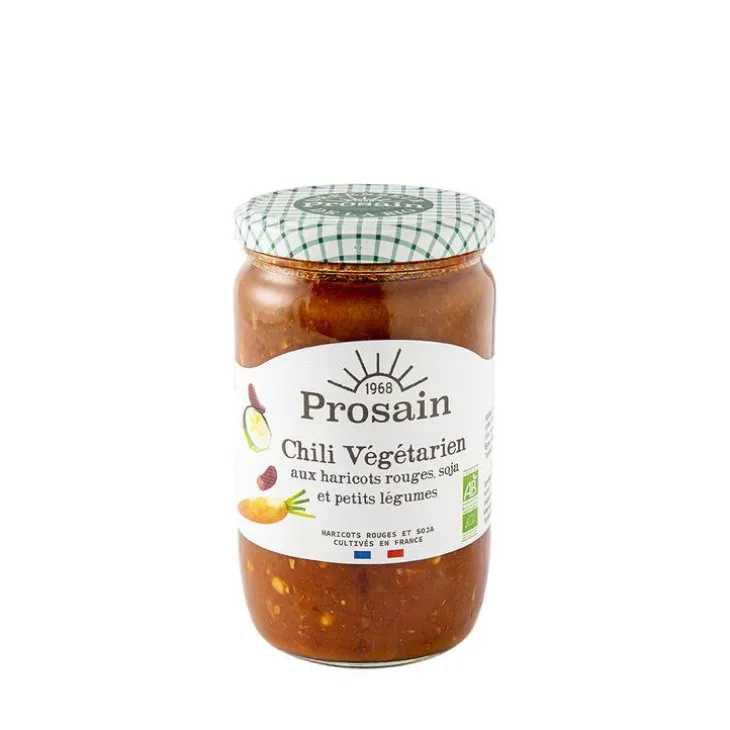 | Composition | Tomate* 25 % (pulpe *, concentré*), eau, haricots rouges réhydratés* 11%, courgettes*, carottes*, 7%, oignons*, poivrons* 6%, protéines de soja* 5%, pois chiches* réhydratés, huile d’olive* vierge extra extraite à froid, épices* (dont piment de Cayenne 0,03%), sel de mer, ail*, basilic*.