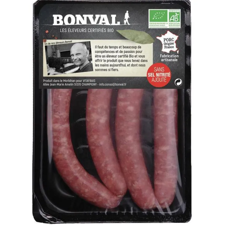 | Composition | viande et gras de porc*, eau, sel, dextrose de maïs*, poivre*, antioxydant (acide ascorbique), ferments, boyau naturel de mouton.