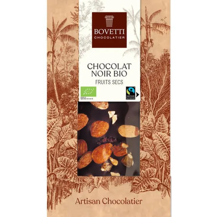 | Composition | Chocolat noir* (masse de cacao* origine St-Domingue, sucre de canne non-raffiné*, beurre de cacao*, poudre de cacao* origine St-Domingue, poudre de vanille*), 8% mélange de fruits secs et fruits séchés en proportion variable (AMANDES*, NOISETTES* d’Italie, écorces d’oranges*, écorces de citrons*, cranberries*, sirop de blé*, sucre de canne blond*, correcteur d’acidité : acide citrique). *issu de l’agriculture biologique