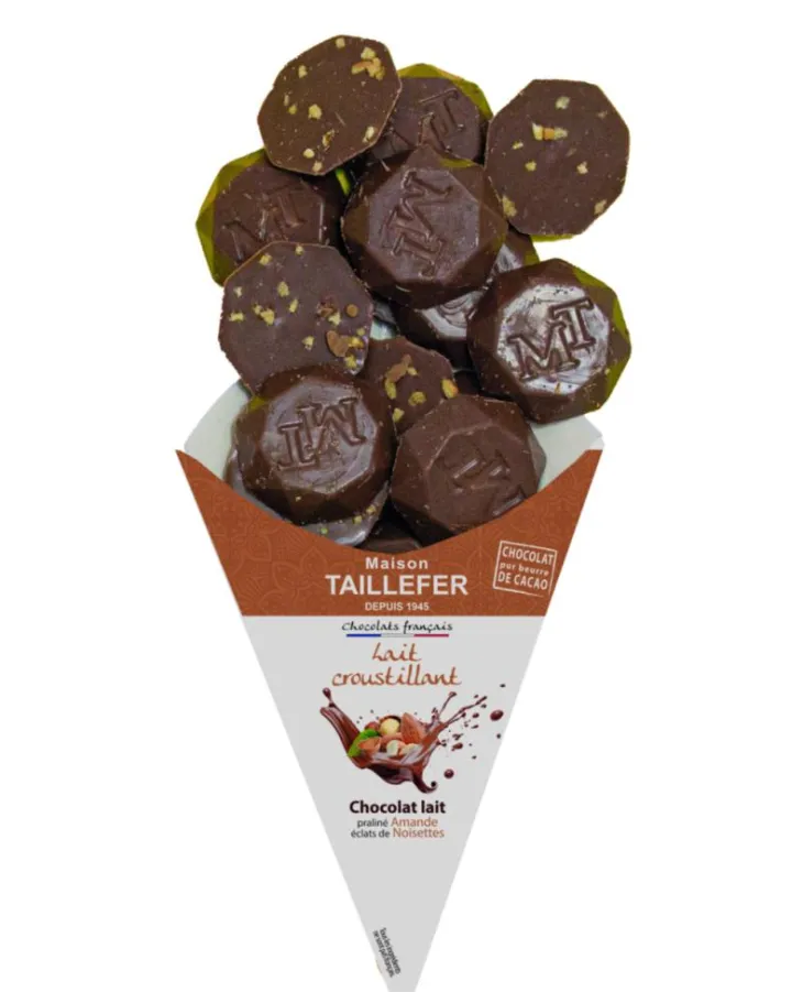 | Composition | chocolat au lait 78% (sucre, beurre de cacao, poudre de lait entier, pâte de cacao, émulsifiant : lécithines (soja)), sucre, amandes 9%, huile d’amande raffinée, farine de blé (gluten), noisettes 0.4%, beurre (lait) concentré, émulsifiant : lécithines (tournesol), lactose (lait), protéines de lait, sel, extrait de malt d’orge (gluten), poudre à lever : E500ii. Traces d’autres fruits à coque. Cacao : 35% minimum dans le chocolat au lait.