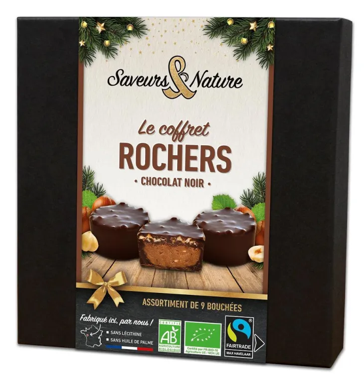 | Composition | chocolat noir* 70% cacao minimum (pâte de cacao*, sucre de canne*, beurre de cacao*), praliné NOISETTE* : 30% (NOISETTES* : 15%, sucre de canne*), éclats de NOISETTES* : 9%, sucre de canne*, beurre de cacao*, poudre de LAIT entier*, pâte de cacao*.