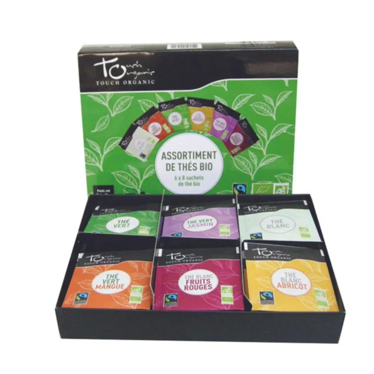 | Composition | Composition 6 variétés de thé : 8 sachets de Thé vert bio, 8 sachets de Thé vert bio au Jasmin, 8 sachets de Thé blanc bio, 8 sachets de Thé vert bio à la mangue, 8 sachets de Thé blanc bio aux fruits rouges, 8 sachets de Thé blanc bio à l’Abricot