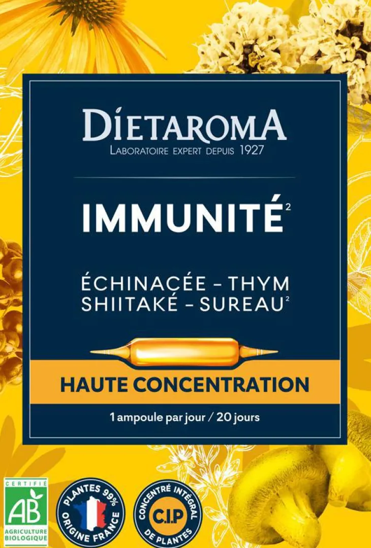 | Composition | Extrait aqueux de parties aériennes d’échinacée*(Echinacea purpurea), de parties aériennes de thym* (Thymus vulgaris), de shiitaké entier* (Lentinula edodes), de baies de sureau* (Sambucus nigra).