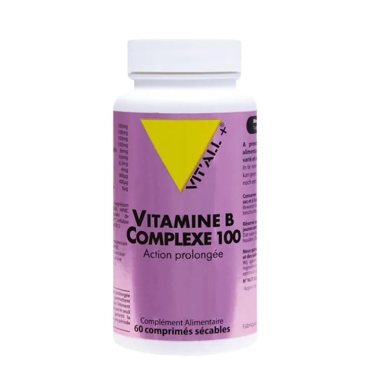 | Composition | Inositol 100.00mg, Choline (Bitartrate) 100.00mg, Vitamine B3 (Nicotinamide) – AR: 625.00% 100.00mg, PABA (acide para-amino benzoïque) 100.00mg, Vitamine B5 (Acide pantothénique) – AR: 600.00% – D-Pantothénate de calcium 36.00mg, Vitamine B2 (Riboflavine) – AR: 684.00% 9.60mg, Vitamine B1 (Thiamine HCl) – AR: 744.00% 8.20mg, Vitamine B6 (Pyridoxine HCl) – AR: 284.00% 4.00mg, Vitamine B8 (Biotine) – AR: 1800.00% 900.00µg, Vitamine B9 – Quatrefolic® – AR: 200.00% – glucosamine (6S)-5-méthyltétrahydrofolate- Forme bioactive 400.00µg, Vitamine B12 (Méthylcobalamine) – AR: 240.00% – forme bioactive 6.00µg