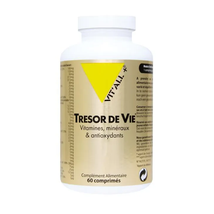 | Composition | Vitamine C (acide L-ascorbique) – AR: 225.00% 180.00mg, Calcium (Bisglycinate) – AR: 15.00% – et citrate 120.00mg, L-Taurine – Acide Aminé 50.00mg, PABA (acide para-amino benzoïque) 37.50mg, Vitamine E (D-alpha tocophérol acétate) – AR: 250.00% 30.00mg, N-acétyl-cystéine 25.00mg, Vitamine B3 (Nicotinamide) – AR: 156.00% 25.00mg, MSM (méthyl-sulfonyl-méthane) 25.00mg, Vitamine B5 (Acide pantothénique) – AR: 300.00% 18.00mg, Bioflavonoides d’orange douce 12.50mg, Rutine 12.50mg, L-Cysteine – Acide Aminé 12.50mg, Vitamine B2 (Riboflavine) – AR: 342.00% 4.80mg, Vitamine B1 (Thiamine HCl) – AR: 381.00% 4.20mg, Bêta-carotène – AR: 75.00% – extrait de Blakeslea trispora 3.60mg, Manganèse (Bisglycinate) – AR: 175.00% 3.50mg, Hespéridine 2.50mg, Trans-Resvératrol – obtenu par fermentation levurienne 2.50mg, Zinc (Bisglycinate) – AR: 25.00% 2.50mg, Vitamine B6 (Pyridoxine HCl) – AR: 142.00% 2.00mg, Myrtille (Vaccinium myrtillus) – fruit – Extrait Standardisé à 15% d’anthocyanosides 1.50mg, Lycopène 1.00mg, Lutéine 1.00mg, Zéaxanthine 1.00mg, Vitamine E (alpha-Tocotriénol) 1.00mg, Vitamine B9 (Acide folique) – AR: 100.00% 200.00µg, Vitamine B8 (Biotine) – AR: 150.00% 75.00µg, Chrome (picolinate) – AR: 62.00% 25.00µg, Sélénium (L-selenomethionine) – AR: 22.00% 12.50µg, Vitamine D3 (Cholécalciférol) – AR: 100.00% 5.00µg, Vitamine B12 (Cyanocobalamine) – AR: 120.00% 3.00µg