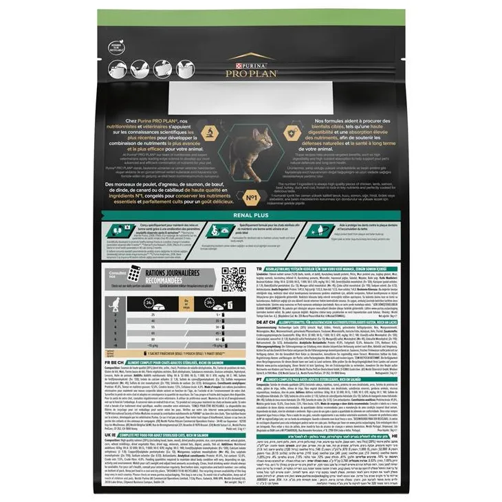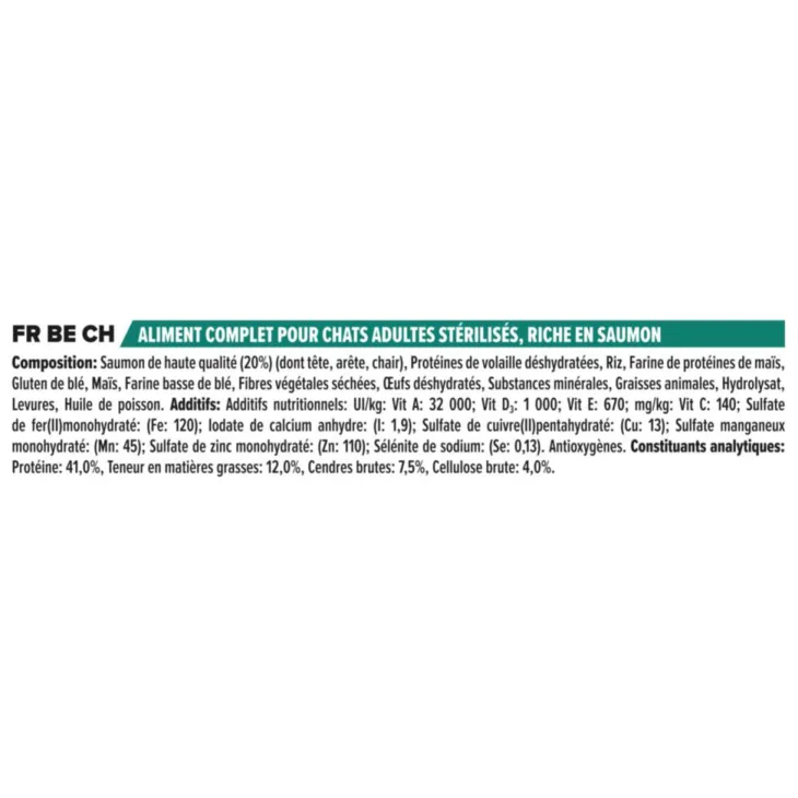 | Composition | Saumon (20 %), gluten de maïs, riz, protéines de volaille déshydratées, maïs, protéines de thon déshydratées, fibres de blé, concentré de protéines de pois, gluten de blé, œufs déshydratés, sels minéraux, graisse animale, hydrolysat, levures.