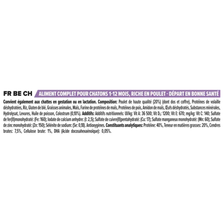 | Composition | Poulet (20%), riz, gluten de maïs, protéines de porc déshydratées, protéines de volaille déshydratées, maïs, graisse animale, amidon de maïs, sels minéraux, gluten de blé, œufs déshydratés, hydrolysat, huile de poisson, colostrum (0,1%).