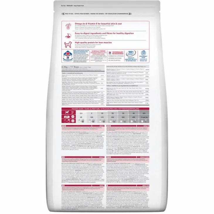 | Composition | au Poulet : Maïs, froment, protéines déshydratées de poulet (9%) et dinde (total volaille 14%), graisse animale, hydrolysat, farine de gluten de maïs, huile de soja, minéraux, pulpe de betterave déshydratée, graines de lin, vitamines, oligo-éléments et bêta-carotène. Avec un antioxydant naturel (mélange de tocophérols).