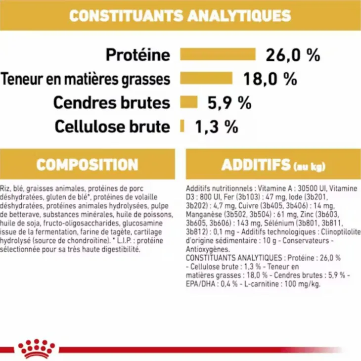 | Composition | Composition viandes et sous-produits animaux, extraits de proteines vegetales, sous-produits d’origine vegetale, cereales, substances minerales, sucres.