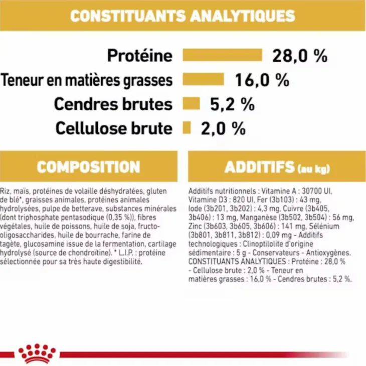 | Composition | Composition proteines de volaille deshydratees, maïs, isolat de proteines vegetales*, fibres vegetales, graisses animales, hydrolysat de proteines animales, riz, ble, pulpe de betterave, gluten de maïs, levures et composants de levures, sels mineraux, huile de poisson, fructo-oligosaccharides, huile de soja.