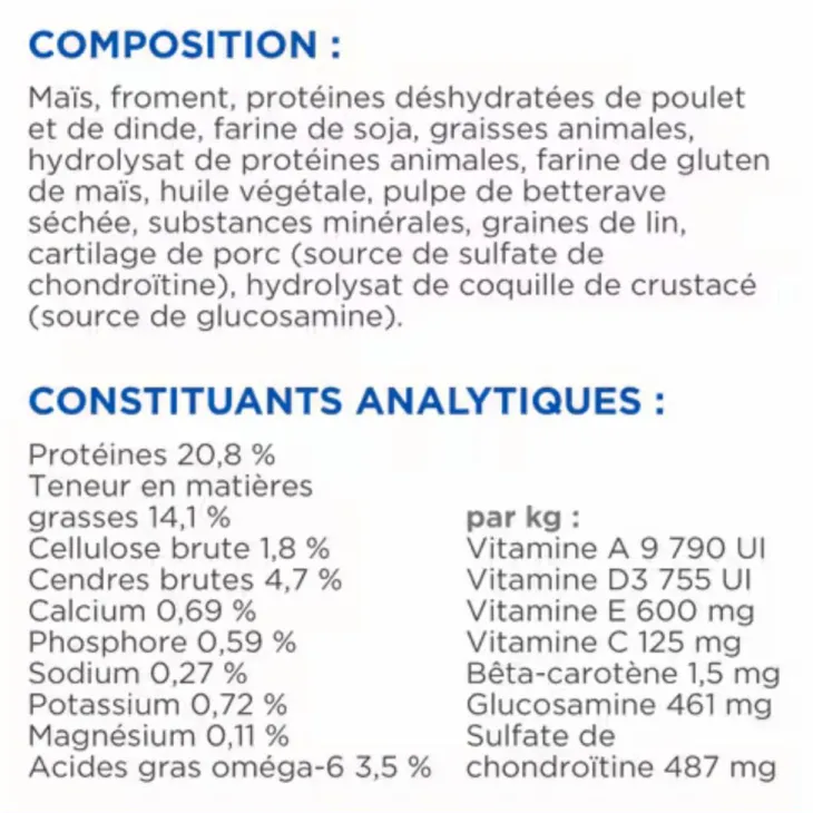 | Composition | au Poulet : Maïs, froment, protéines déshydratées de poulet (7%) et dinde, farine de graines de soja, graisse animale, hydrolysat, farine de gluten de maïs, huile de soja, pulpe de betterave déshydratée, minéraux, graines de lin, riz de brasserie, vitamines, oligo-éléments , cartilage de porc (source de chondroïtine sulfate), hydrolysat de coquille de crustacé (source de glucosamine). Avec un antioxydant naturel (mélange de tocophérols).