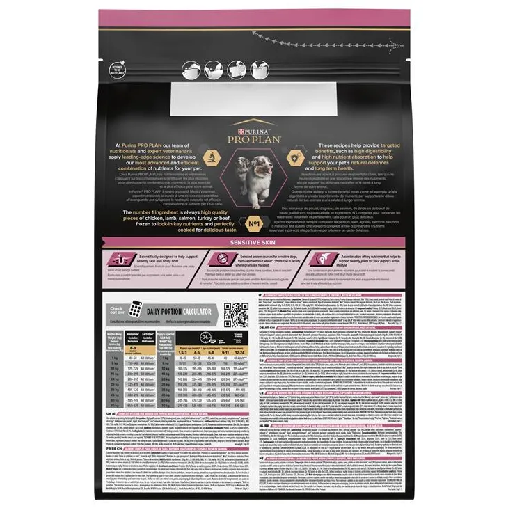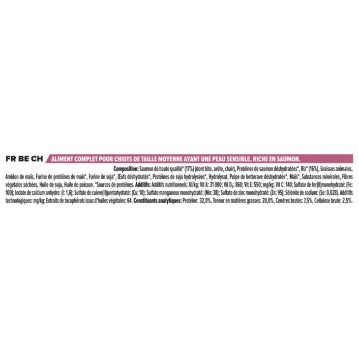 | Composition | COMPOSITION : Saumon* (17%), protéines de saumon déshydratées*, riz* (16%), graisse animale, amidon de maïs, gluten de maïs*, farine de soja*, protéines de soja déshydratées*, œuf déshydraté*, hydrolysat, pulpe de betterave déshydratée*, sels minéraux, maïs*, cellulose, huile de soja, huile de poisson.* Sources de protéines