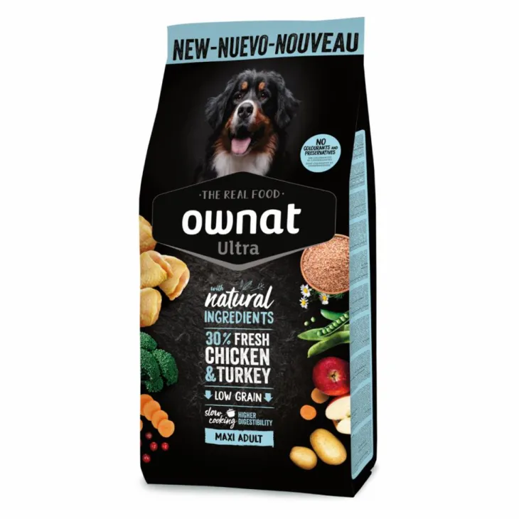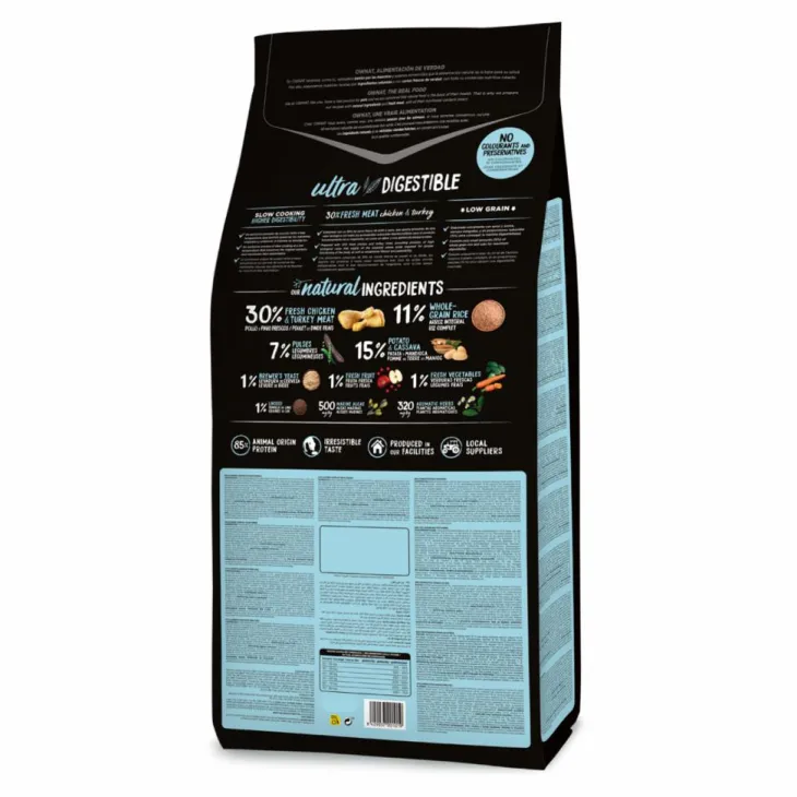 | Composition | Poulet déshydraté (20 %), poulet frais* (15 % min. avant la cuisson), dinde fraîche* (15 % min. avant la cuisson), riz complet* (11 %), pomme de terre déshydratée* (9 %), graisse de volaille (préservée avec des antioxydants naturels), racines de manioc* (6 %), petits pois entiers* (4 %), gousse de caroube* (3 %), légumes et fruits frais avant la cuisson (pomme* 1 %, carotte* 0,5 %, brocoli* 0,5 %), porc déshydraté (2 %), protéines de poulet hydrolysées, levure de bière* (1 %), graines de lin* (1 %), huile de saumon (préservée avec des antioxydants naturels), pulpe de betterave, sel gemme*, luzerne déshydratée*, racines de chicorée (FOS)*, extrait de levure (MOS), algues marines déshydratées* (500 mg/kg), glucosamine (500 mg/kg), yucca shidigera, chondroïtine sulfate (100 mg/kg), airelles* (100 mg/kg), thé vert* (80 mg/kg), échinacée* (80 mg/kg), fleur de camomille* (80 mg/kg), fenouil* (80 mg/kg). *Ingrédients naturels