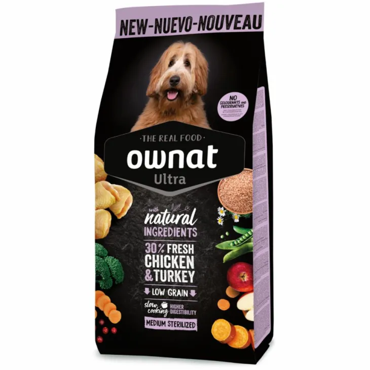 | Composition | Poulet frais* (15 % min. avant la cuisson), dinde fraîche* (15 % min. avant la cuisson), poulet déshydraté (14 %), patate douce déshydratée* (10 %), riz complet* (9 %), porc déshydraté (5 %), racines de manioc* (5 %), petits pois entiers* (4 %), graisse de volaille (préservée avec des antioxydants naturels), avoine complète* (4 %), gousse de caroube* (3 %), pulpe de betterave, légumes et fruits frais avant la cuisson (pomme* 1 %, carotte* 0,5 %, brocoli* 0,5 %), saumon déshydraté, protéines de poulet hydrolysées, levure de bière* (1 %), huile de saumon (préservée avec des antioxydants naturels), oeuf déshydraté* (1 %), graines de lin* (1 %), sel gemme*, luzerne déshydratée*, racines de chicorée (FOS)*, extrait de levure (MOS), algues marines déshydratées* (500 mg/kg), glucosamine (500 mg/kg), yucca shidigera, chondroïtine sulfate (100 mg/kg), airelles* (100 mg/kg), thé vert* (80 mg/kg), échinacée* (80 mg/kg), fleur de camomille* (80 mg/kg), fenouil* (80 mg/kg). *Ingrédients naturels