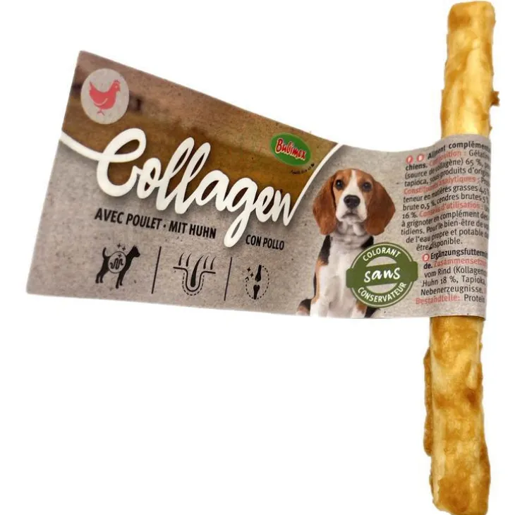 | Composition | Gélatine de bœuf (source de collagène) 65 %, poulet 18 %, tapioca 10 %, sous-produits d’origine végétale 6,98 %