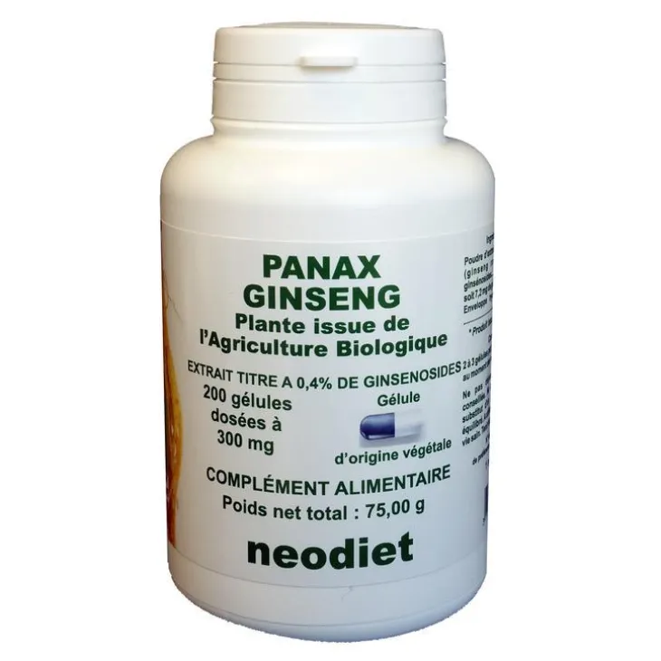 | Composition | Composition pour 3 gélules : poudre d’extrait de panax ginseng (ginseng rouge) titré à 0,4 % de ginsénosides 900 mg, gélule d’origine végétale