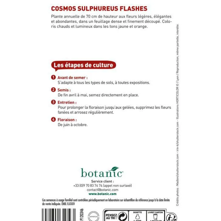 | Conseils d’entretien | Le Cosmos réussit dans tous les types de sols, à bonne exposition.Pour prolonger la floraison jusqu’aux gelées, supprimez les fleurs fanées et arrosez régulièrement.