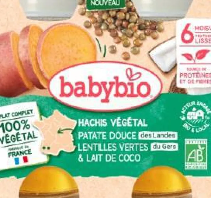 | Composition | Patate douce des Landes* 46%, eau de cuisson, lentilles cuites de France* 12% (eau, lentilles*), lait de coco du Sri Lanka* 6% (noix de coco*, eau), purée de tomates de Nouvelle-Aquitaine* 5%, oignons de France* 5%, huiles végétales* (colza*, tournesol*), marjolaine*, ail d’Espagne*. ?*Ingrédients issus de l’agriculture biologique