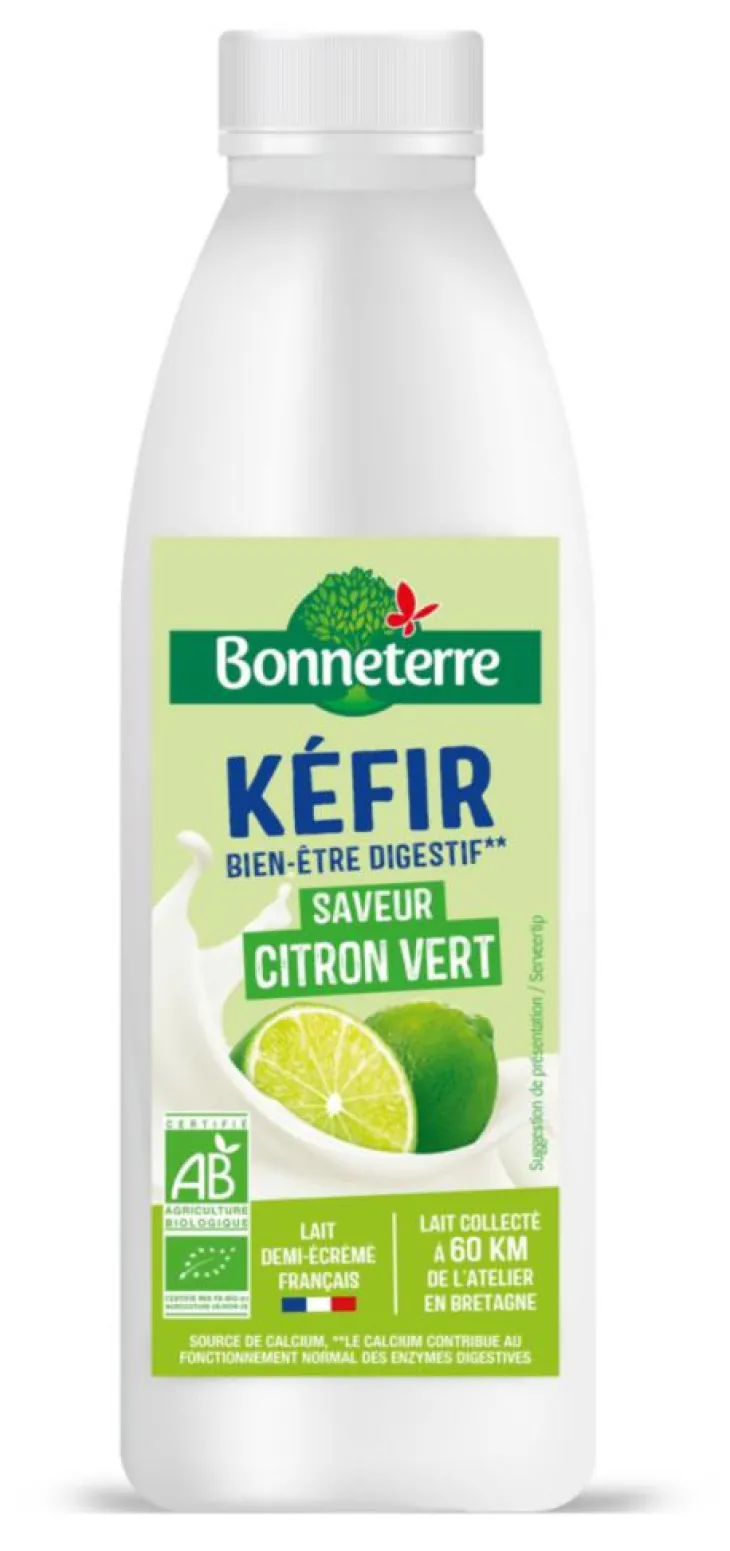 | Composition | Lait* demi-écrémé pasteurisé 96%, sucre de canne*, arôme naturel de citron vert* 0,2%, ferments lactiques (lait) spécifiques du kéfir. *Ingrédient issu de l’Agriculture Biologique Allergènes : Lait
