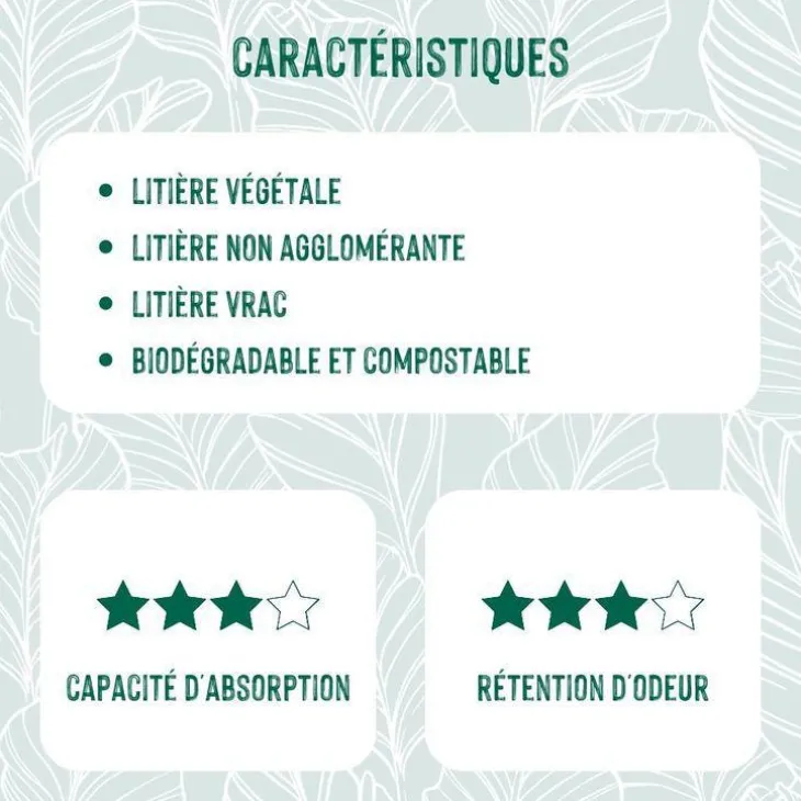 | Conseils d’entretien | Verser environ 5-7 cm de litière dans un bac propre et sec. Enlever quotidiennement la litière souillée, puis compléter avec de la litière propre pour maintenir le niveau. Régulièrement, remplacer intégralement la litière après avoir vidé et nettoyer le bac.