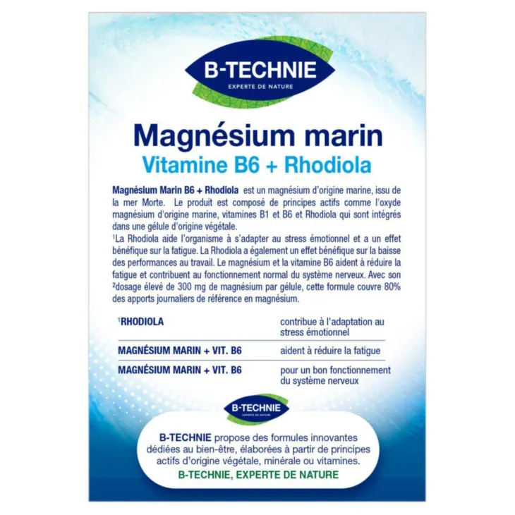 | Composition | Oxyde de magnésium d’origine marine ; gélule d’origine végétale: hydroxypropylméthylcellulose ; extrait de racine de rhodiola (Rhodiola rosea – support: dextrine) ; antiagglomérant : sels de magnésium d’acide gras ; vitamine B6 ; vitamine B1.