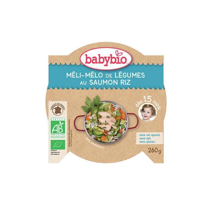 | Composition | Légumes* 53% (pommes du Val de Loire* 15%, oignons d’Espagne*, carottes de France* 12%, courgettes de Provence* 5%, petits pois d’Espagne* 5%, « champignons de Paris » d’Italie*), eau de cuisson, saumon d’Irlande* 10%,riz* 8%, jus de citron d’Italie*, huiles végétales* (colza*, tournesol*), persil de France*, ail d’Espagne*. * Ingrédients issus de l’agriculture biologique