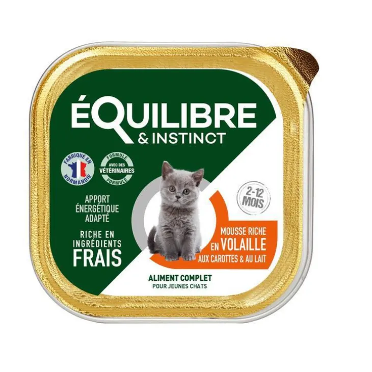 | Conseils d’entretien | Pour un chaton en activité normale, nourri avec un mode d’alimentation sèche et humide (bi-nutrition), donner en 1 à 2 repas : Âge de l’animal / Ration de mousses / Ration de croquettes4 mois / 54g / 12g9 mois / 62g / 14g11 mois / 46g / 10gPour un chaton en activité normale, nourri exclusivement avec une alimentation humide, donner en 1 à 2 repas :Âge de l’animal / Ration de mousses4 mois / 108g9 mois / 123g11 mois / 92gIl est recommandé d’adapter la quantité selon l’activité, la race et l’âge de votre chaton.Après ouverture, conserver au réfrigérateur (+4°C).