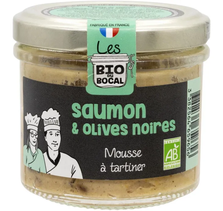 | Composition | Chair de saumon* (51%) (POISSON), crème fraîche* (LAIT), OEUF*, huile d’olive*, flocon de pomme de terre* (pomme de terre*, extrait de romarin*), olive noire* (3%), sel, poivre*. Peut contenir des traces de SOJA et CELERI. *Issus de l’agriculture biologique.