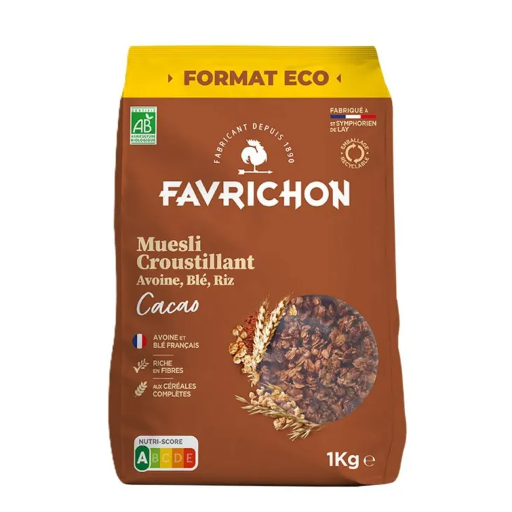 | Composition | Céréales* complètes 72,9% (AVOINE *, BLE *, riz*), sucre de canne * non raffiné, huile de tournesol*, cacao * maigre en poudre