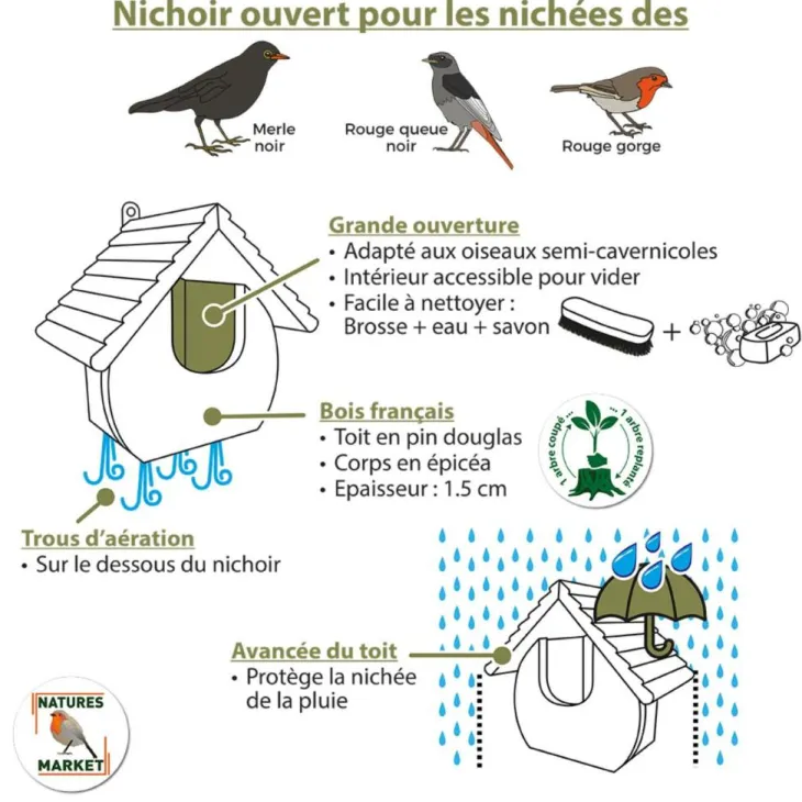 | Conseils d’entretien | Nettoyez et videz le nichoir en septembre après les nichées et février qu’il a servi pendant l’hiver et peut être souillé, afin qu’il soit propre pour les nouveaux arrivants. A sec, ou à l’eau et au savon.