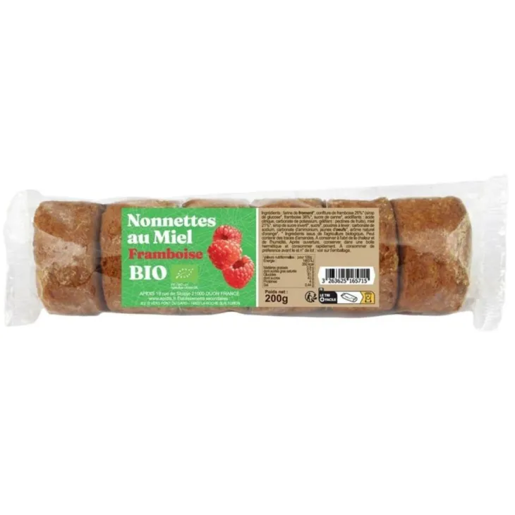 | Composition | Farine de froment*, confiture de framboise 26%* (sirop de blé*, framboise* 36%, sucre de canne*, correcteurs d’acidité: acide citrique, carbonate de potassium, gélifiants:pectine de fruits), miel 21%*, sirop de sucre inverti*, sucre*, poudre à lever (carbonate acide de sodium, carbonate d’ammonium, jaunes d’oeufs, huile essentielle d’orange douce*). * Ingrédients issus de l’agriculture biologique