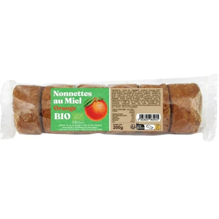 | Composition | Farine de froment*, confiture d’orange 26%* (sirop de blé*, orange* 36%, sucre de canne*, correcteurs d’acidité: acide citrique, carbonate de potassium, gélifiants:pectine de fruits), miel 21%*, sirop de sucre inverti*, sucre*, poudre à lever (carbonate acide de sodium, carbonate d’ammonium, jaunes d’oeufs, huile essentielle d’orange douce*). * Ingrédients issus de l’agriculture biologique