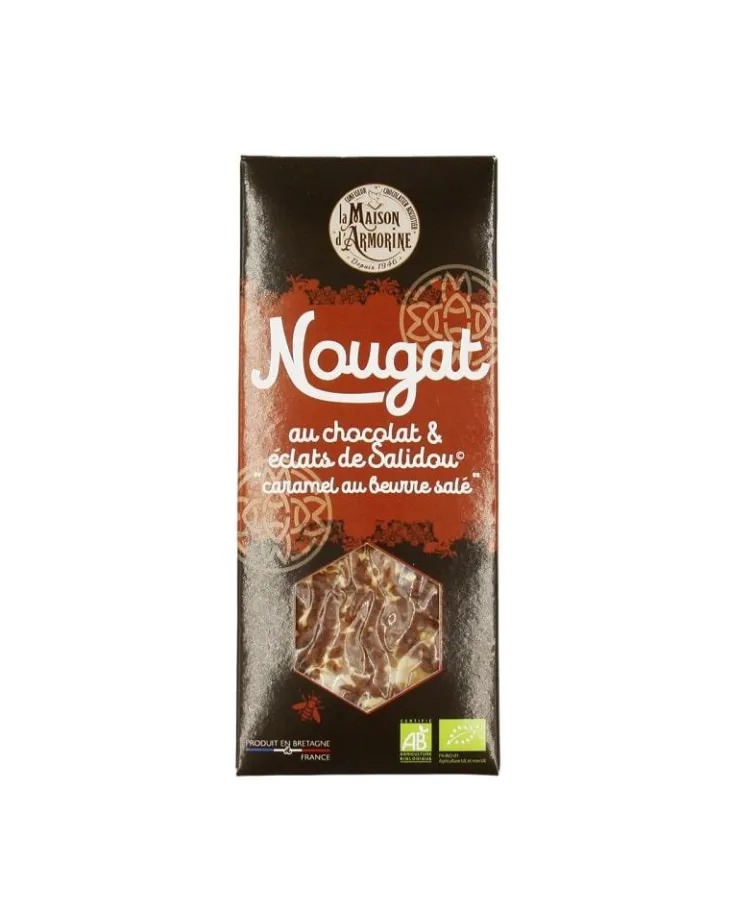 | Composition | Miel Toute fleurs 30%*, Sucre de Cannes Blond*, AMANDES*, NOISETTES*, Chocolat * 7%, eclats de caramel beurre salé * 7%, Eau, Sucre glace*, Blancs d’OEUFS déshydratés*, Feuille Azyme* (fécule de pomme de terre*, huile de tournesol*), Sel de St Armel certifié par nature et progrès, Sucre vanillé* (sucre* et Vanille de Madagascar*). Allergènes : OEUFS, NOISETTES ET AMANDES, LAIT, TRACES POSSIBLES DE FRUITS A COQUES ET DE FARINE