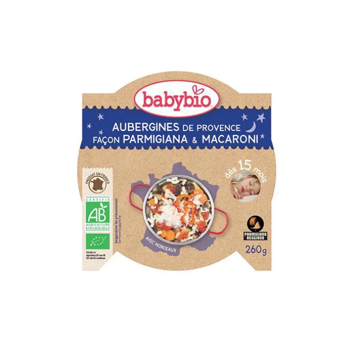 | Composition | Légumes* 77% (aubergines de Provence* 20%, purée de tomates d’Italie* 17%, carottes de France* 16%, pommes de terre du Val de Loire* 10%, poivrons d’Espagne* 8%, oignons d’Espagne*), eau de cuisson, macaroni* 5% (semoule de blé dur*, blanc d’oeuf*),parmesan d’Italie* 3,5%, huile d’olive vierge extra*, ail d’Espagne*, origan*. * Ingrédients issus de l’agriculture biologique