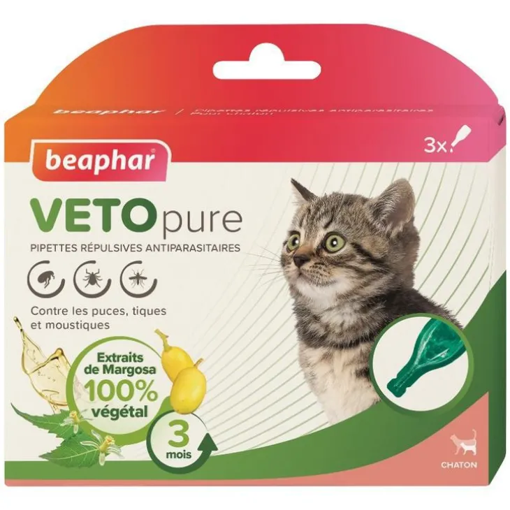 | Conseils d’entretien | Ouvrir la pipette en rompant son extrémité et appliquer son contenu sur le cou du chaton, derrière les oreilles. Sur les chatons blancs, le produit peut provoquer une coloration temporaire du pelage à l’endroit du dépôt.