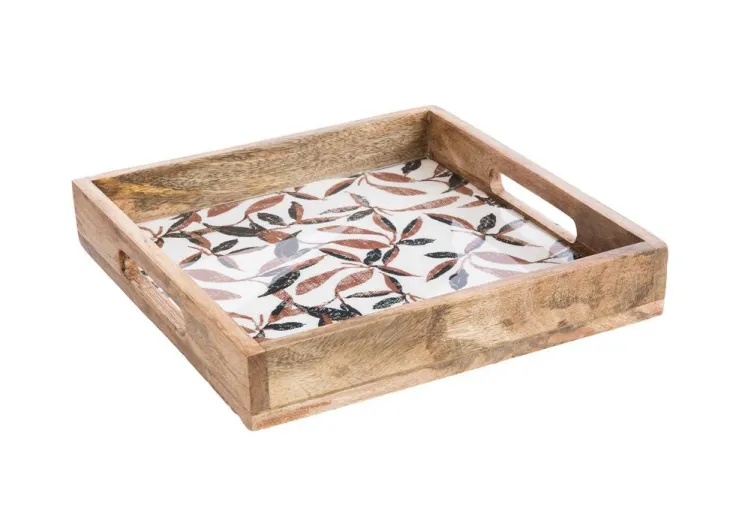 Plateau carré feuillage d’automne coloris blanc en bois de manguier – 30 x 30 x 6 cm