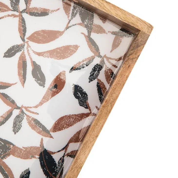 Plateau carré feuillage d'automne coloris blanc en bois de manguier - 30 x 30 x 6 cm