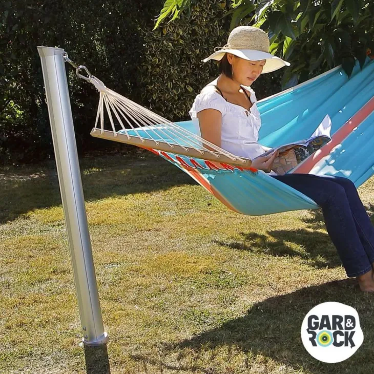 | Conseils d’entretien | LE CHOIX DU HAMAC : Nous recommandons l’utilisation d’hamac à barre simple comme par exemple chez LA SIESTA : https://www.lasiesta.com/fr-fr/collections/hamac-a-barresInstallez seulement un poteau si vous souhaitez associer la fixation de votre hamac avec un arbre. Sinon il serait nécessaire de prévoir deux poteaux pour permettre une installation autonome.Amovible : Votre équipement sera facilement transportable et avec un minimum d’encombrement pour le stockage hivernal par exemple ou pour l’emmener avec vous en vacances!Implantez des bases d’ancrage à divers endroits afin de pouvoir déplacer votre lit de soleil partout dans votre jardin et selon vos souhaits : Sieste à l’ombre, instant bronzage au soleil, lecture au calme ou encore apéro détenteAfin d’assurer une fixation optimale et notamment en cas de terrain meuble, nous recommandons de sceller la base d’ancrage dans du béton. Le mode opératoire est indiqué sur la notice et nous vous invitons à visualiser cette vidéo: https://bit.ly/40mV1Me!Dans la même gamme évolutive Gard&Rock : Base d’ancrage (428-001), Pied pour parasol droit (428-002), Kit Poteaux Multisports (428-003), Borne solaire (428-005), Pied pour parasol déporté (428-007), Mât pour voile d’ombrage (428-011)