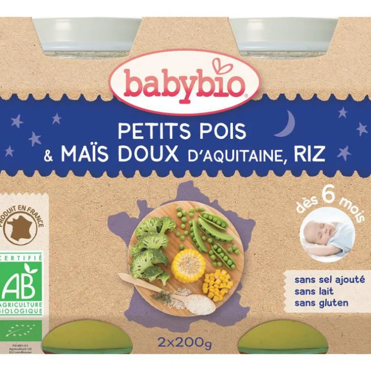 | Composition | Légumes* 58% (petits pois d’Espagne* 25%, maïs doux d’Aquitaine* 15%, oignons d’Espagne*, brocolis d’Espagne* 8%), eau de cuisson, riz* 7%, huiles végétales* (colza*, tournesol*), thym de France*. * Ingrédients issus de l’agriculture biologique