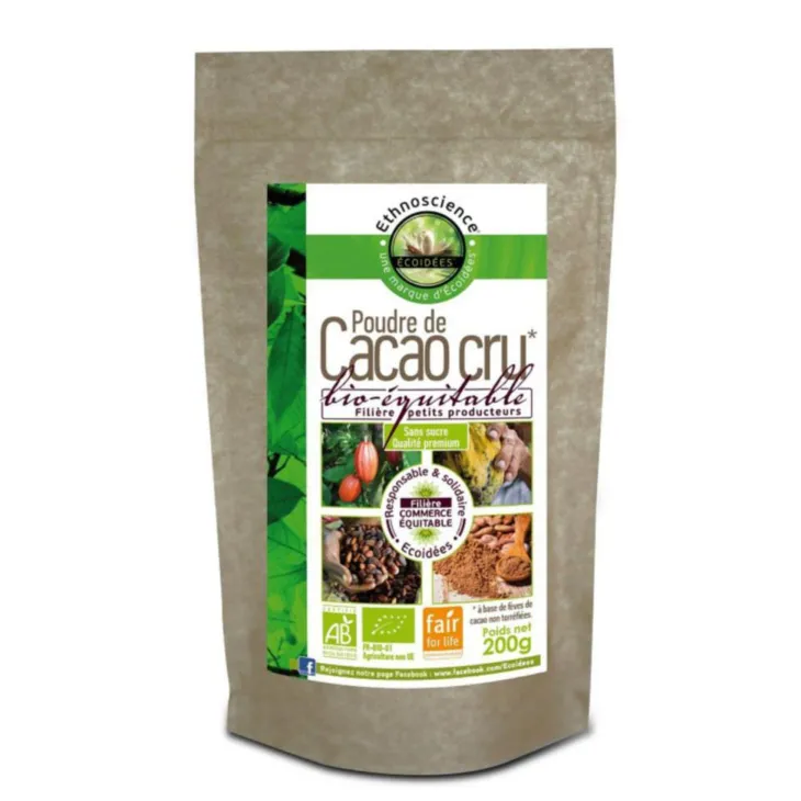 | Composition | Poudre de fèves de cacao dégraissée (Theobroma cacao) (1) (2) (1) Produit issu de l’agriculture biologique (2) Commerce Equitable contrôlé selon le référentiel Fair for Life 100% du total des ingrédients d’origine agricole sont issus du commerce équitable