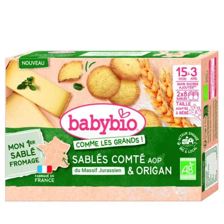 | Composition | Amidon de blé*, farine de blé* 29%, lait écrémé en poudre de France*, comté AOP du Massif Jurassien* 8 %, huile de tournesol*, beurre de France*, origan*, poudre à lever: carbonates d’ammonium, vitamine B1.
