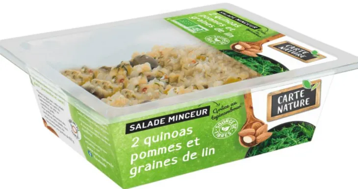 | Composition | Quinoas* 40% (quinoa* blanc, quinoa*rouge)petits pois*, vinaigrette*(huile tournesol*, eau,vinaigre alcool*, MOUTARDE*(vinaigre alcool*,graines MOUTARDE*, eau, sel)sel,épaississants:gomme xanthane–gomme guar*),pomme* 8,7%,topinambour* 5,5%, jus de citron*,AMANDE*,oignon*,graine courge*,courgette*,MOUTARDE*l’ancienne (eau, graine de MOUTARDE*, vinaigre d’alcool*, sel), graine de lin* 1%, aneth* 1%, sel. * Ingrédients issus de l’Agriculture Biologique