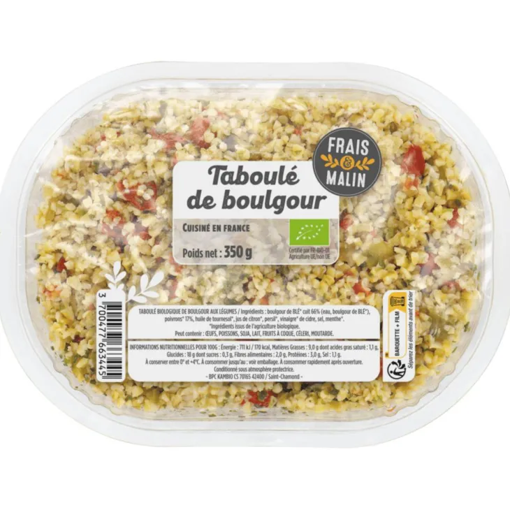 | Composition | Boulgour de BLE* cuit 66% (eau, boulgour de BLE*), poivrons* 17%, huile de tournesol*, jus de citron*, persil*, vinaigre* de cidre, sel, menthe* *Ingrédients issus de l’agriculture biologique