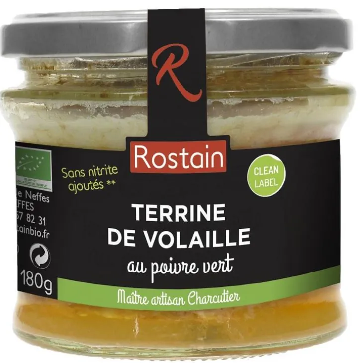 | Composition | Viande* de volaille (30% origine France), viande et gras de porc* (37% origine France), foie de porc* (12.9% origine France), couenne de porc* (origine France), fécule de pommes de terre*, COGNAC* (3.4% contient des SULFITES), OEUF*, échalote*, sel de mer, poivre vert* (0.48%), poivre noir*, muscade* * Ingrédients issus de l’agriculture Biologique