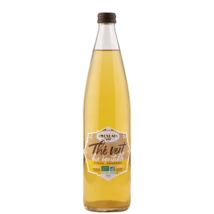 | Composition | Infusion de thé vert Bio (eau, feuilles thé vert Bio équitable) 93%, sirop d?agave Bio, jus concentré de citron Bio 3,5%, arôme naturel de gingembre Bio. Teneur en extrait de feuilles de thé vert Bio Gunpowder 5 g/L. Ce thé glacé Bio artisanal contient des polyphénols (25mg/100ml) reconnus pour leur pouvoir antioxydant.