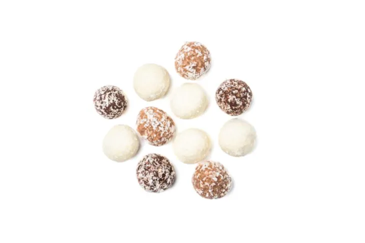 | Composition | Noisette*, noix de coco râpée*, sucre de canne*, chocolat blanc* (sucre de canne*, beurre de cacao*, poudre de lait entier*), chocolat noir* (masse de cacao*, sucre de canne*, beurre de cacao*, extrait de vanille*), chocolat au lait* (sucre de canne*, beurre de cacao*, poudre de lait entier*, masse de cacao*, extrait de vanille*), agent d’enrobage* (gomme d’acacia*, sucre*, miel*). * Issu(e) de l’agriculture biologique.
