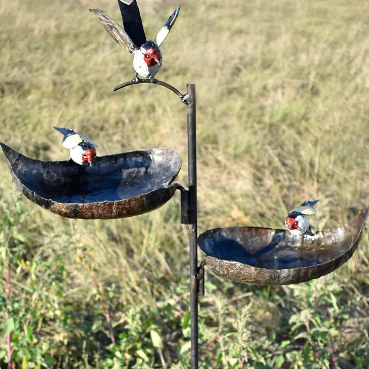 Tuteur métal 2 mangeoires cœurs et 3 oiseaux peint main