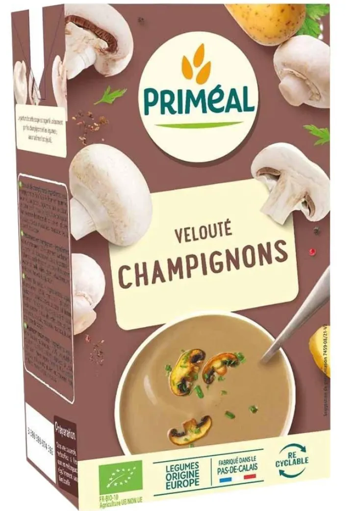 | Composition | Eau, champignons de Paris* 25%, légumes* (pommes de terre*, courgettes*, oignons*), huile de colza*, sel, amidon de riz* *issus de l’agriculture biologique