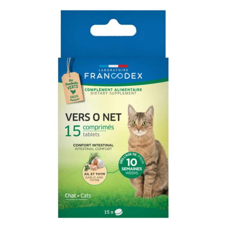 | Conseils d’entretien | Les chats peuvent être soumis à des stress, des changements alimentaires oudes agents agresseurs (oeufs ou larves de parasites) entrainant des problèmesintestinaux. Les comprimés VERS O NET FRANCODEX contiennent dessubstances aromatiques de plantes (ail et thym), ainsi que des oligo-éléments,pour participer au confort intestinal de votre chat et renforcer ses défensesnaturelles.